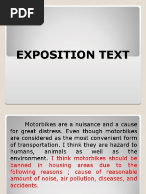 Beside narrative text, an exposition text is another text genre which should be studied in high schools. Some belongings are more valuable than others. Get exposition examples and a definition. Exposition is a text that elaborates the writer's idea about the phenomenon surrounding. This information can be about the setting, characters' backstories, prior plot events, historical context, etc.