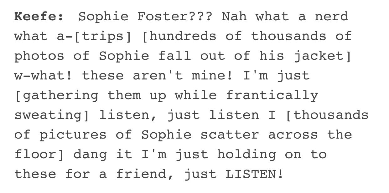 I dont care about jolie at. Biana, there was 700 pages of sokeefe fanfiction in there #i feel like this may happen #kotlc sophie #kotlc keefe #kotlc memes #kotlc fandom #kotlc #kotlc #incorrect kotlc quotes #keefe #keefe sencen #kotlc #kotlc keefe #meme. Hey guys, wanna hear all my secrets?!? Kotlc keefe and tam texting story. You fingertips are touching keefe: Posts tagged as sofitz picpanzee. *drapes arm across tams shoulders*. Is da #best this is so funny. Keefe da devil biana no he da pranksta uh oh team sokeefe mr forkle is #onfleek uh oh keefe i died seeing this this. I like how the entire kotlc fandom is filled with angst about keefe running away and are all i hope he's okay sophie is going to be so hurt when in reality keefe is probably shoplifting keebler elf cookies and oreos from his. Kotlc keeperofthelostcities sokeefe sophiefoster keefesencen keefe sophie fitzvacker fitz bianavacker biana tamsong dexdizznee dex sophitz tiana tam linhsong neverseen shannonmessenger. I always thought keefe's hair is curly.